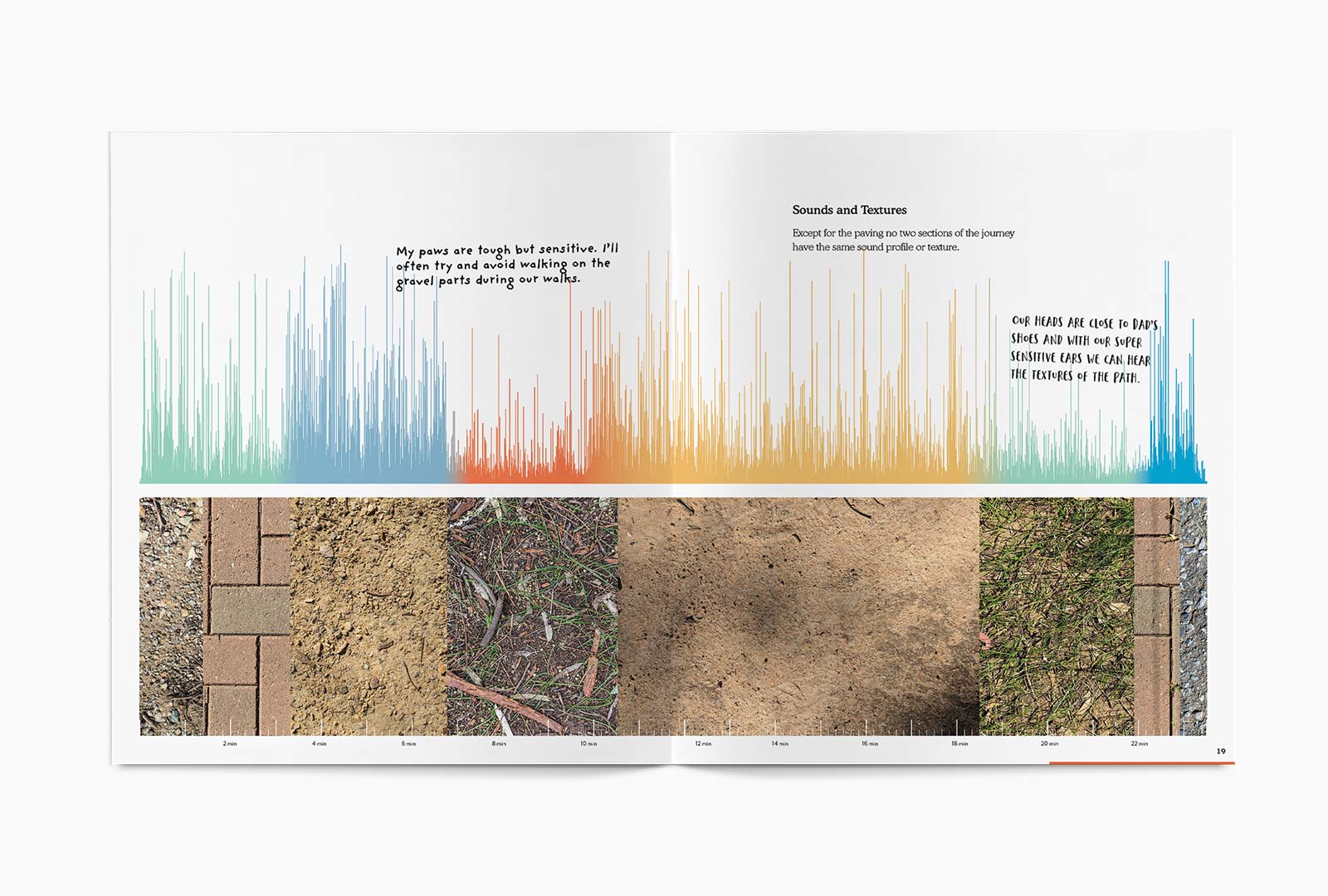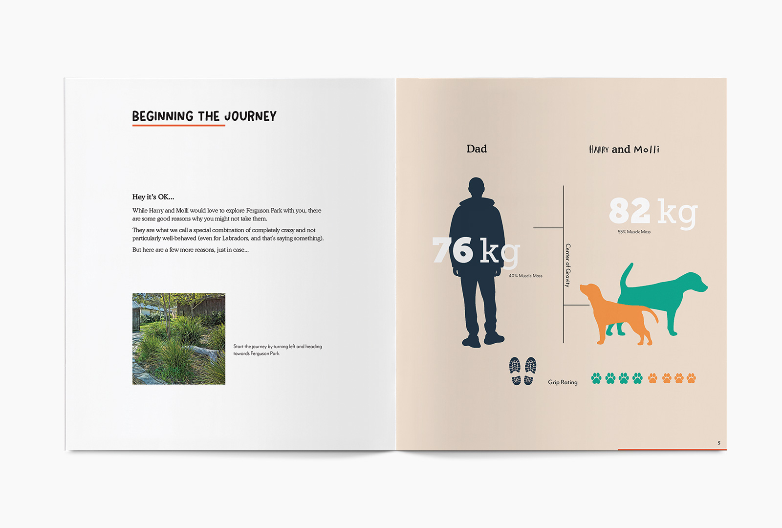 The solution to this design challenge began with detailed research. Over several weeks, a significant amount of data was collected. What sort of data can you collect while walking the dogs? Lots. The data was then brought to life with a range of intricate charts along with images, hand-drawn illustrations and descriptions of the journey. To bring everything together, a children’s storybook-style collection of colours and typography, along with a good dose of humour, was used.